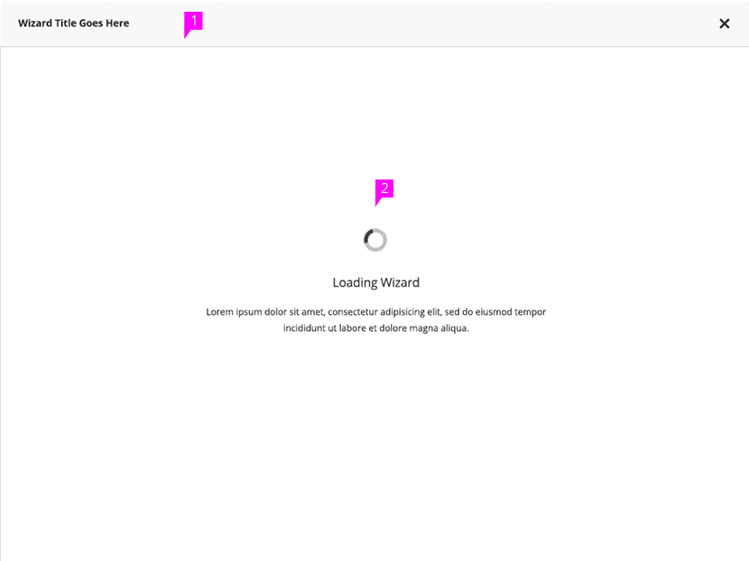 - Loading Wizard State (optional): For cases when wizard will take a few moments to load, we recommend using a loading indicator and short message informing the user that the wizard is loading. Wizard will be empty besides the message and indicator.