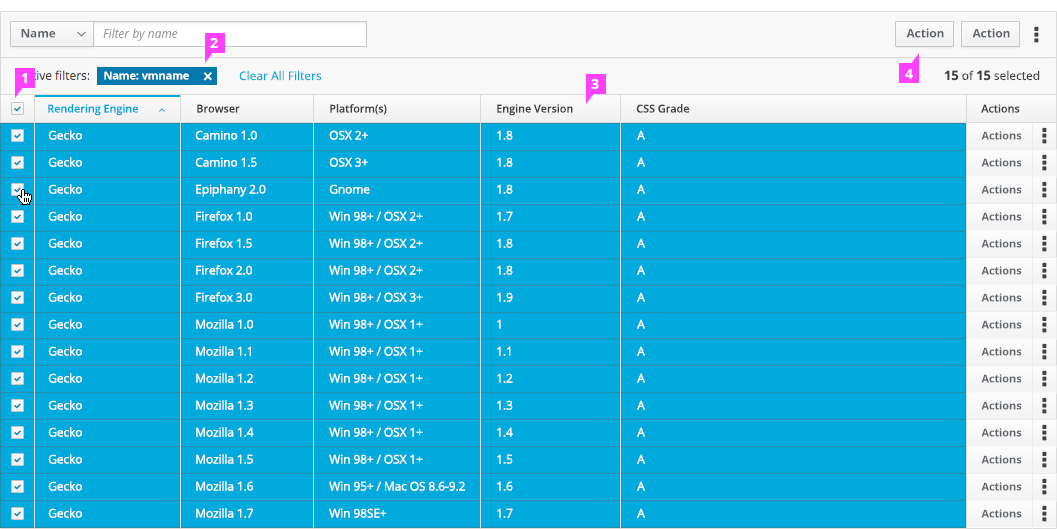 Select All Rows: Selecting the checkbox in the header row selects all rows on the page. The total number of rows selected is shown near the table action buttons.